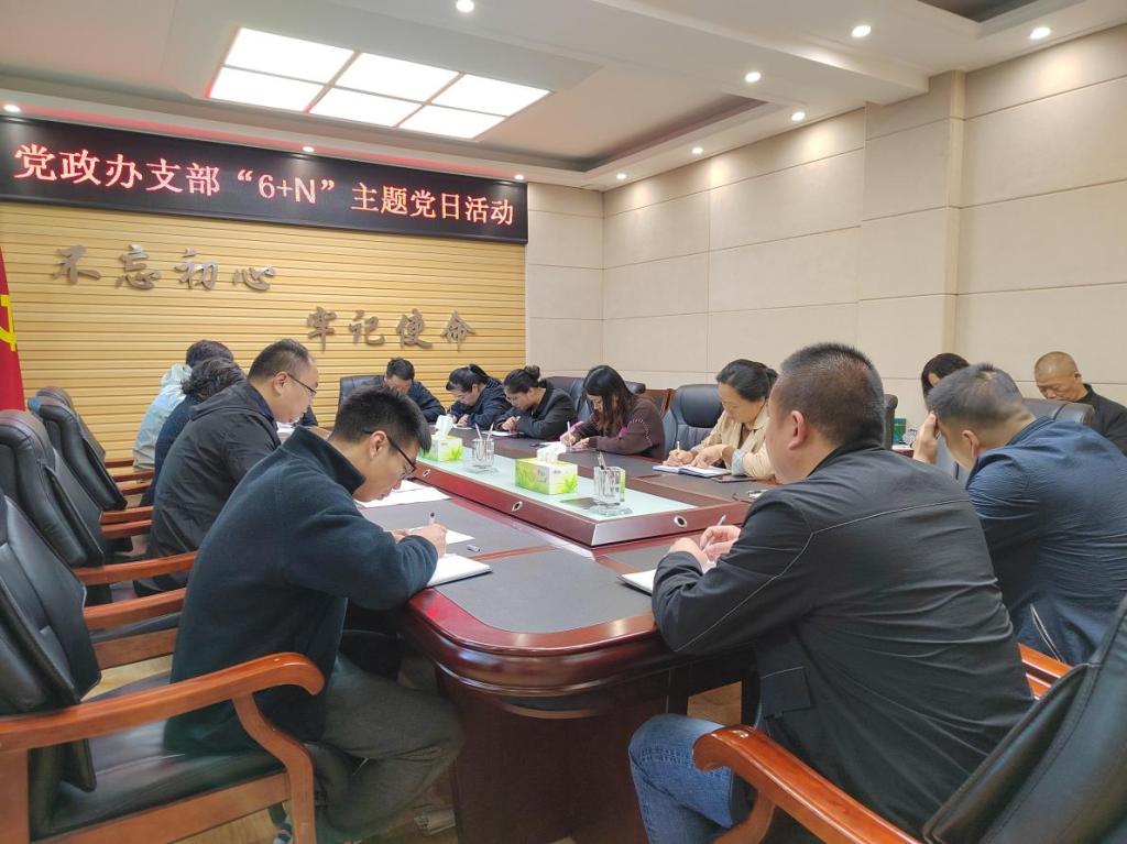 10月28日上午,党政办支部在308会议室开展“6+N”主题党日活动。会议由支部书记何超飞主持,党政办公室全体党员参加。